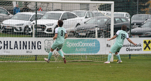 1. Foto links: Der Moment vor dem 1:0 für den SVK - REBERNIK prüft den Mühlgrabener Schlussmann, der den scharfen Schuss zwar abblocken kann, doch im Hinterhalt lauerte KAPPEL, der den Abstauber souverän verwerten konnte. Der SVK hatte den eindeutig besseren Start und konnte sich so einige gute Chancen herausspielen. Die Führung war zu diesem Zeitpunkt auch verdient. Mit der ersten Standardsituation für die Gäste konnten diese ausgleichen, doch unsere Jungs hatten die passende Antwort parat. Dank eines Elfmeters konnten wir erneut in Führung gehen.