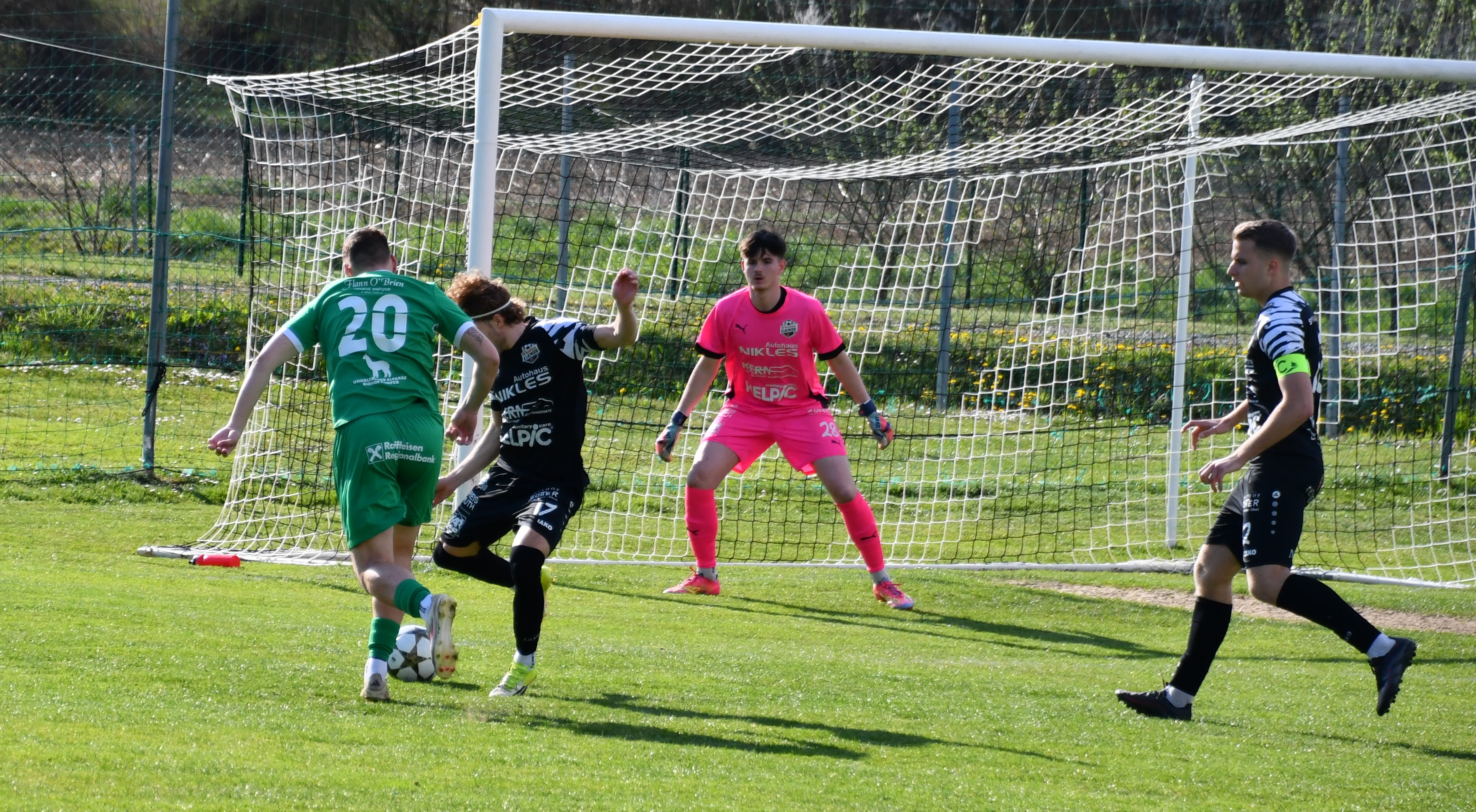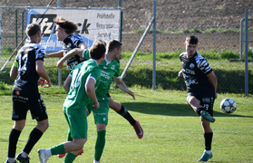 Fotos links: Dank eines schnellen Treffer durch Schlitzohr REBERNIK lief zunächst noch alles nach Plan (siehe Foto), aber Schlaining entpuppte sich als spielerisch sehr starke und auch ballsichere Mannschaft. Bereits in der ersten Hälfte war das Spiel völlig ausgeglichen. Durch einen Zauberfreistoß ging man dennoch mit einer knappen Führung in die Pause. In Hälfte zwei gab es ein ähnliches Bild. Mit einem Elfmeter hätte man die Führung ausbauen können. Leider erriet der Torwart die Ecke - auch der Nachschuss konnte blockiert werden. Da die Hausherren nicht aufgaben, wir aber durch den späten Ausgleich noch alles riskierten, wurde ein präziser Flachschuss uns zum Verhängnis. Im letzten Spiel musste man also die erste Saisonniederlage hinnehmnen.