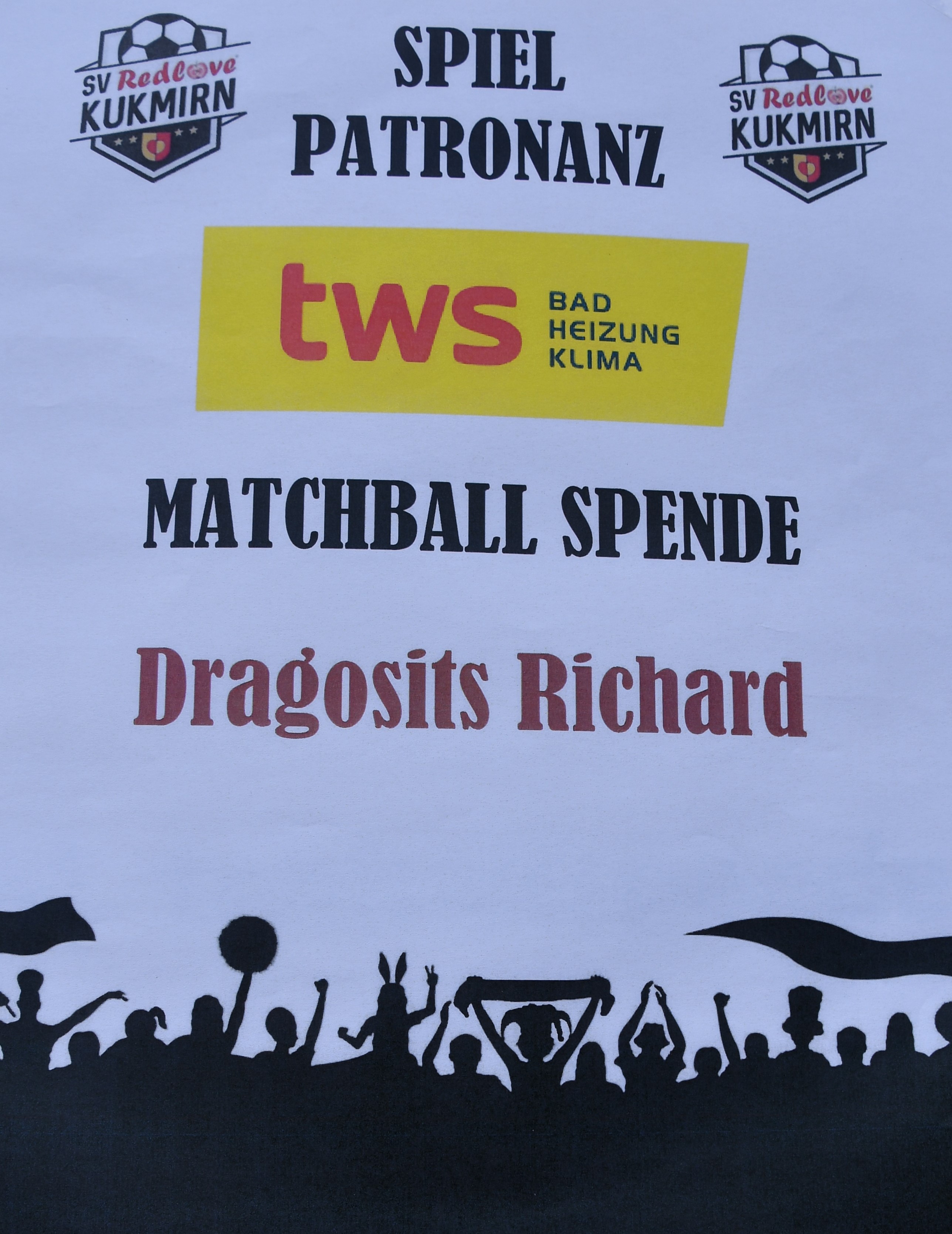 Der SV Redlove Kukmirn bedankt sich heute ganz herzlich bei der Fa. "TWS" für die Spielpatronanz sowie bei unseren langjährigen Freund & Gönner Hr. DRAGOSITS Richard für die Übernahme des Matchballes!