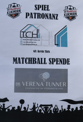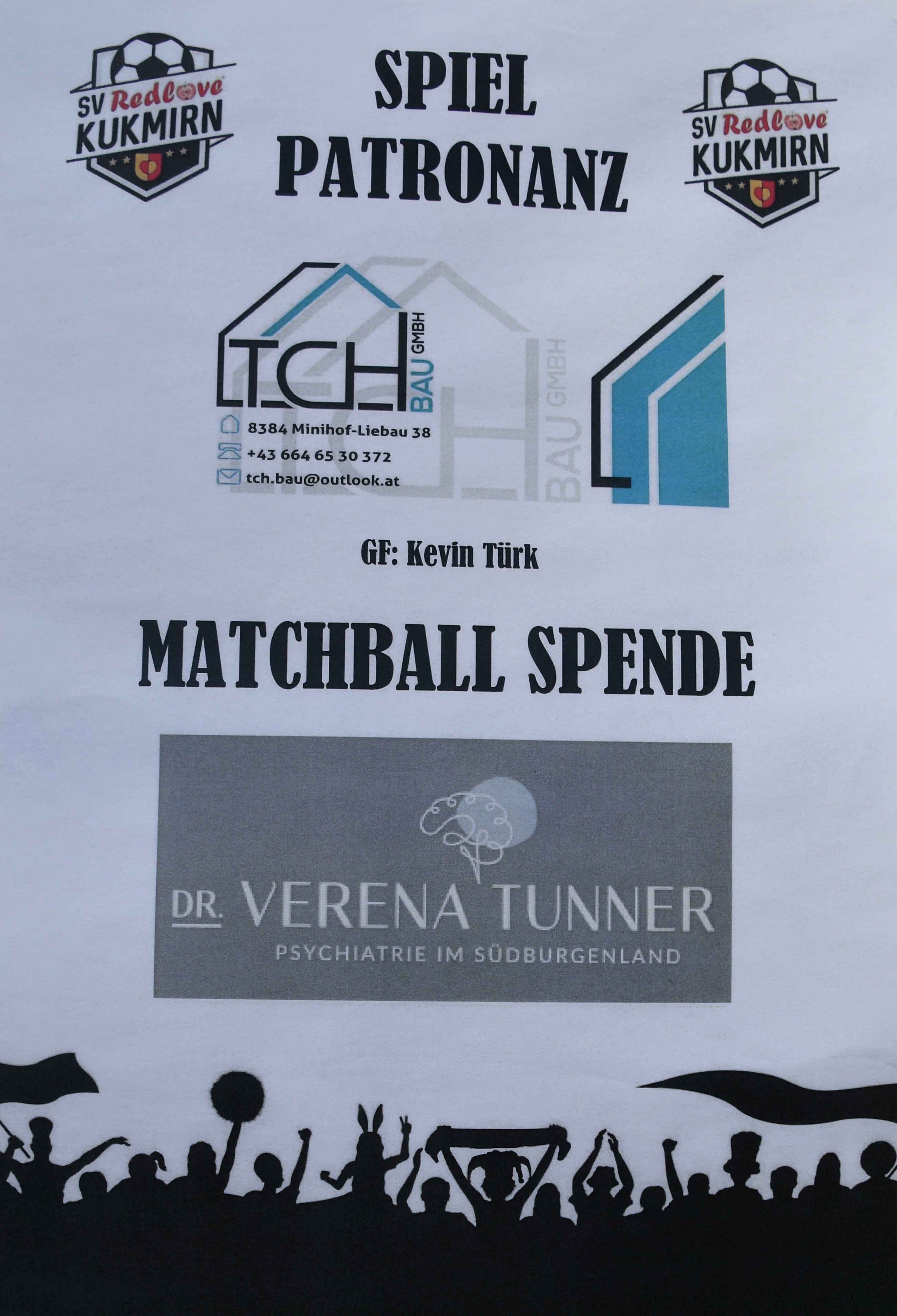 Der SV Redlove Kukmirn bedankt sich heute ganz herzlich bei GF TÜRK Kevin von "TCH BAU GmbH" für die Spielpatronanz sowie bei Dr. TUNNER Verena ("Psychiatrie im Südburgenland") für die Übernahme des Matchballes!