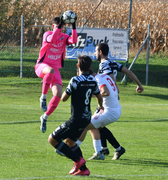 2. Foto links: Unser Schlussmann war vor allem in Hälfte zwei ordentlich gefordert. Wir wollten den knappen Vorsprung über die Zeit bringen, doch die Gäste erwiesen sich als Meister der Eckbälle - zwei an der Zahl brachten ebensoviele Tore! Ärgerlich, denn so drohte das Spiel zu kippen. Der "Tabellenführer in spe" (nach Verlustpunkten) schaffte durch einen weiteren Strafstoß die erstmalige Führung. Kurz darauf hätte es, in diesem Schockmoment hinein, beinahe erneut klingeln können. Mit starken Paraden von HAMR und auch eingem Glück überbrückten wir diese kurze Drangphase. Die Zeit verstrich gnadenlos. Doch noch einmal warfen wir alles nach vorne. Unser Wille wurde schließlich belohnt. Aus einem Gewussel im Strafraum heraus, konnte REBERNIK die Lücke finden und aus kurzer Distanz zum 3:3 Endstand einnetzen. Ein hartes Stück Arbeit, aber wir bleiben UNBESIEGT (und das, obwohl heute mit FRÜHMANN, RADL und HORVAT drei Stammspieler vorgegeben werden mussten)!!