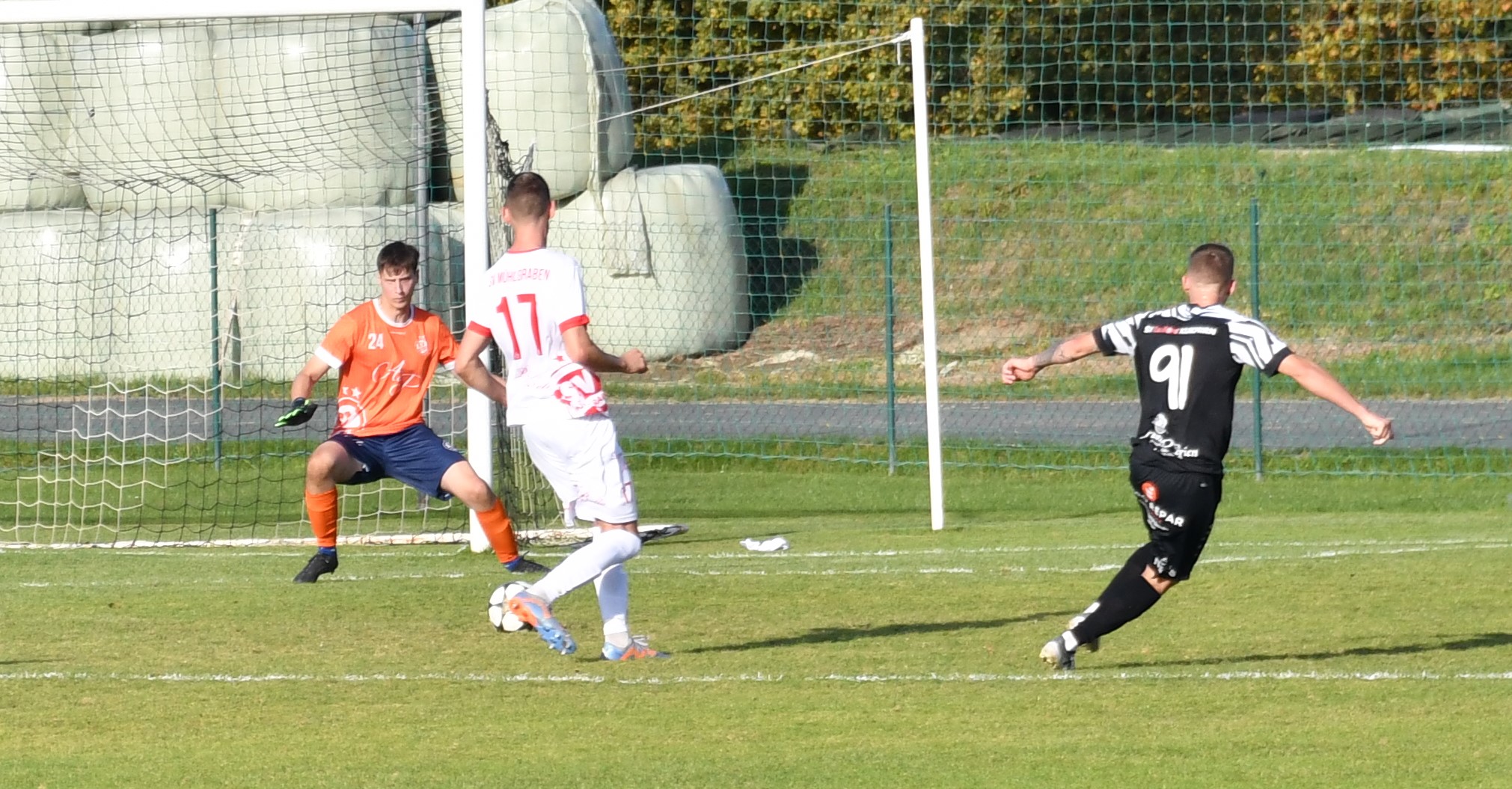 Fotos links: Der SVK konnte mit Grafenschachen die nächste schwere Hürde überspringen. Die defensiv gut gestaffelten, hochstehenden Gäste hatten zwar nicht viele Chancen, aber die wenigen waren allesamt brandgefährlich. In Summe aber waren wir das aktivere Team, hatten vor allem in Hälfte zwei (nach dem Ausschluss eines Grafenschacheners) auch weitaus mehr Spielanteile und gingen als verdienter Sieger vom Platz. Am Bild kommt unser aufgerückter Verteidiger HORVAT knapp nicht an die Kugel. REBERNIK konnte ebenfalls nicht gestoppt werden und erzwang somit zwei Tore. Mit diesem Sieg konnten wir unsere Position im Spitzenfeld der Liga behaupten.